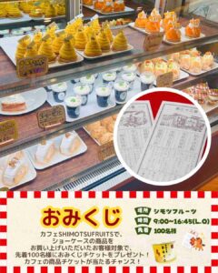 カフェSHIMOTUFUITSUのショーケース商品をお買い上げの方におみくじが引けます!各日先着100様!当たりチケットが出ると次回ご来店時にご利用できます!